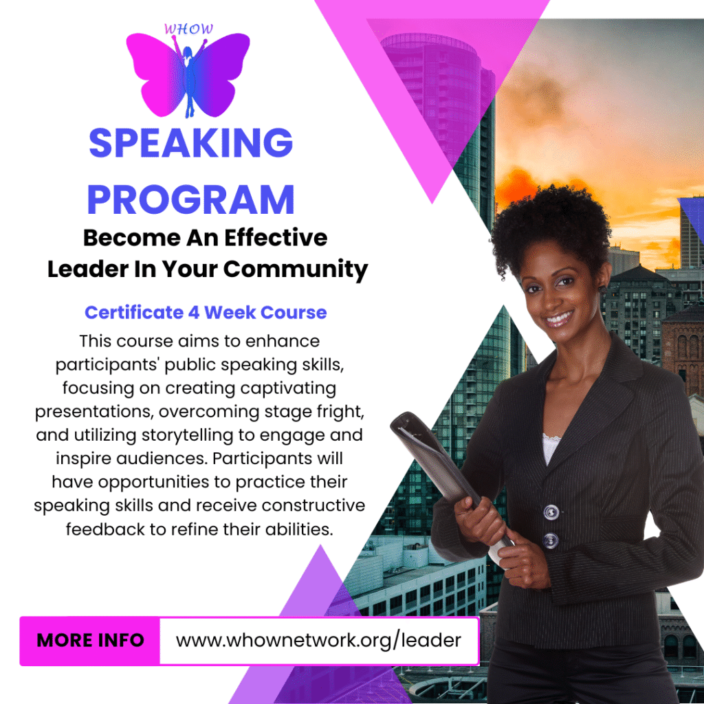 The leadership program is designed for individuals interested in being a leader in their community. The program offers certificates for leadership, mentorship, and speaking. All skills are learned through our 12 week (2hr) program.
